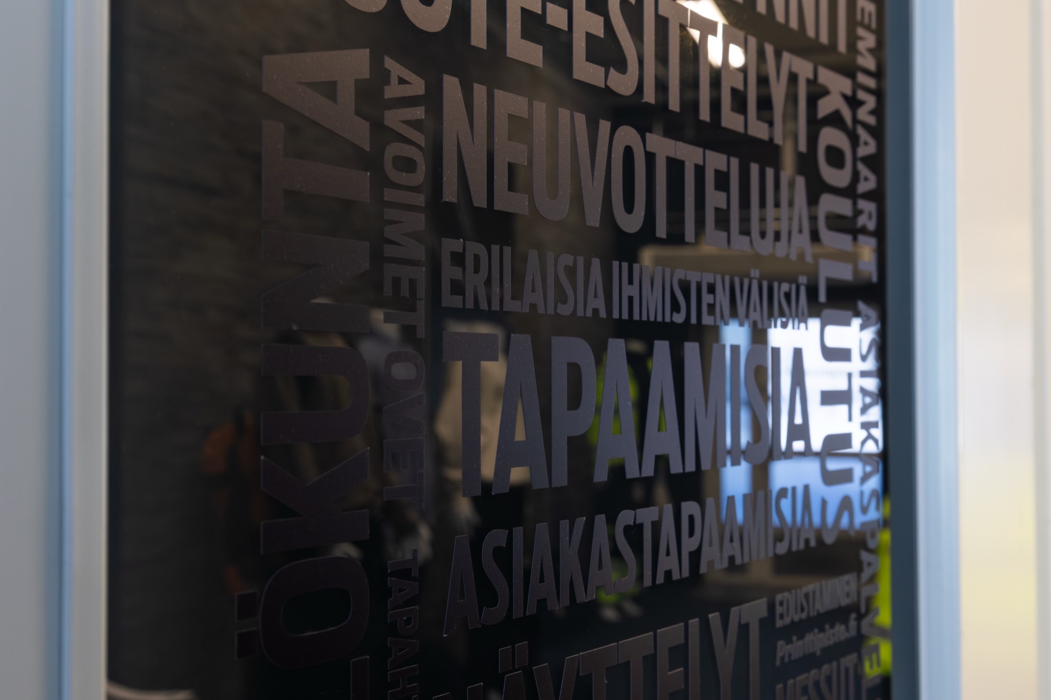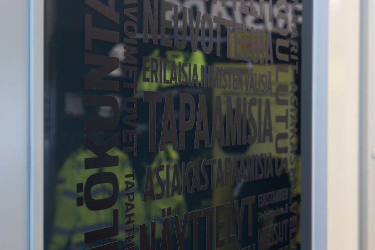 Selkeät opasteet ja suuntaviitat. Huurrelasikalvot näkösuojaksi ikkunoihin.