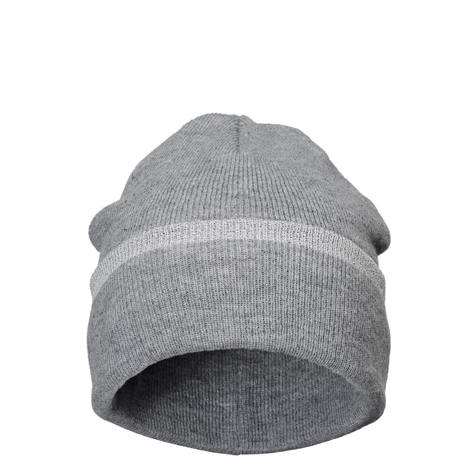 Kaksinkertainen pipo on vaaleanharmaata sileää neuletta ja käänteeseen on neulottu heijastava raita. Pidempi malli antaa mahdollisuuden kääntää reunaa reilusti tai jättää pipon roikkumaan rennosti takaraivolle. Tämä pipo pitää pään lämpimänä kylmälläkin säällä.