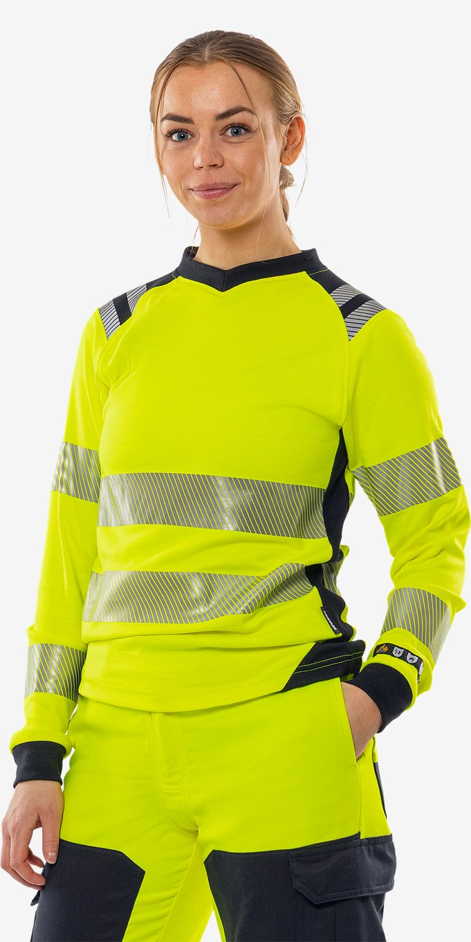 Palosuojattu näkyvä naisten t-paita korkealla valokaarisuojauksella. Pehmeä t-paita itsessään paloturvallisesta materiaalista ja miellyttävillä joustavilla heijastenauhoilla. PFAS-vapaa.