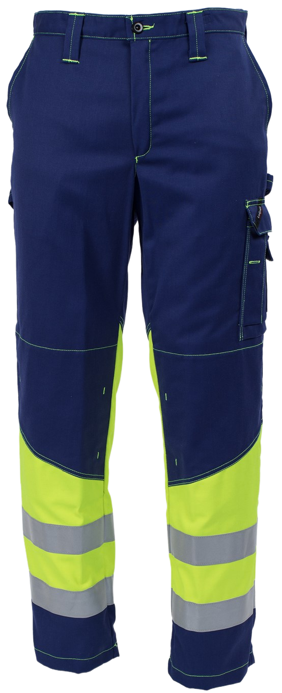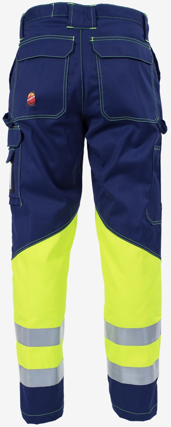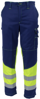 Palosuojatut huomiotyöhousut työhön, jossa tarvitaan palosuojauksen lisäksi hyvää näkyvyyttä. Housuissa on sisäpuoliset polvisuojataskut sekä mitta- ja reisitaskut.