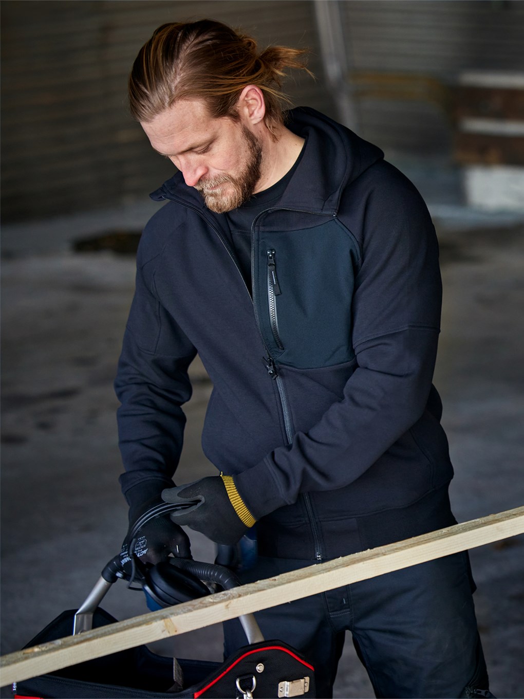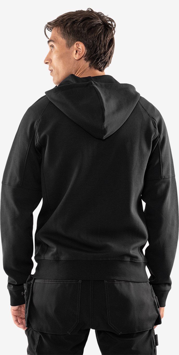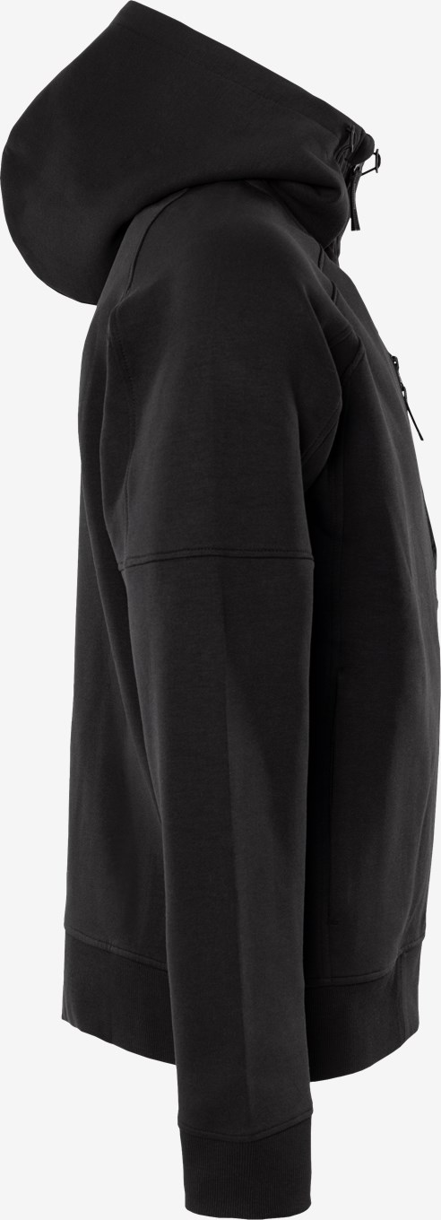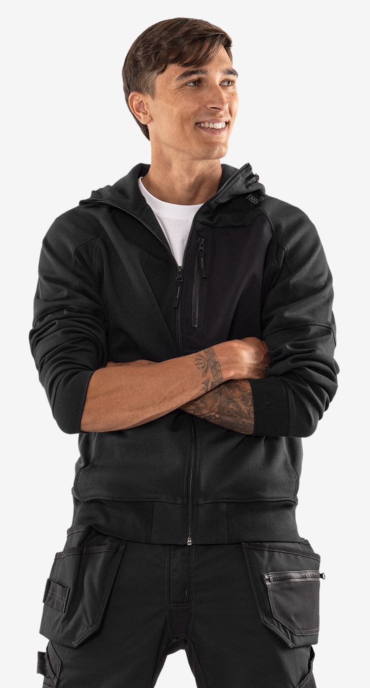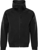 Puuvillasta ja kierrätetystä polyesterista valmistettu huppari täyspitkällä vetoketjulla, siisti kaksipuolinen materiaali. Mukava takki, jossa säädettävä huppu, rintatasku ja vetoketjulliset etutaskut. Konsepti: Alnaryd. PFAS vapaa