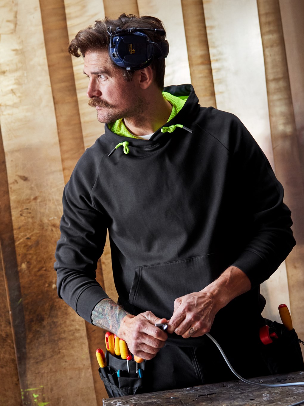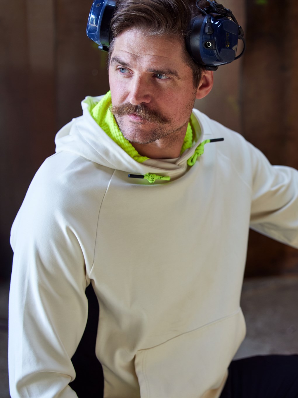 Huppari joustavasta kaksipuoleisesta materiaalista, joka on valmistettu luomupuuvillasta. Pehmeä ja sileä hupullinen collegepaita 4-suunnan joustolla tarjoaa erinomaisen käyttömukavuuden ja liikkumisvapauden. Suunniteltu resorisivupaneeleilla ja kontrastikeltaisilla yksityiskohdilla. Unisex tuote saatavana koosta 2XS eteenpäin. Konsepti: Tyresta PFAS vapaa