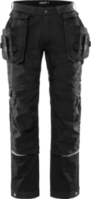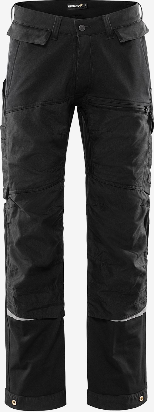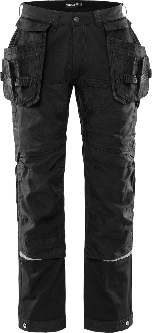 Toiminnalliset rakentajan housut täysin 4-suuntaan joustavasta materiaalista irrotettavilla riipputaskuilla. Käytännölliset tuuletusaukot polvissa ja toisessa reidessä aukeavat vetoketjuilla. Kestävät työhousut CORDURA® -vahvistetulla etuosalla. Housujen lahkeita on hieman pidennetty edestä ja ne sopivat tiukasti kenkien ympärille soran ja lian sisäänpääsyn estämiseksi. Housut on osittain valmistettu kierrätetystä tekstiilijätteestä. PFAS vapaa PFAS vapaa