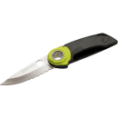 Sharp, locking blade (partly serrated, suitable also for cutting ropes, cords, webbing etc.).