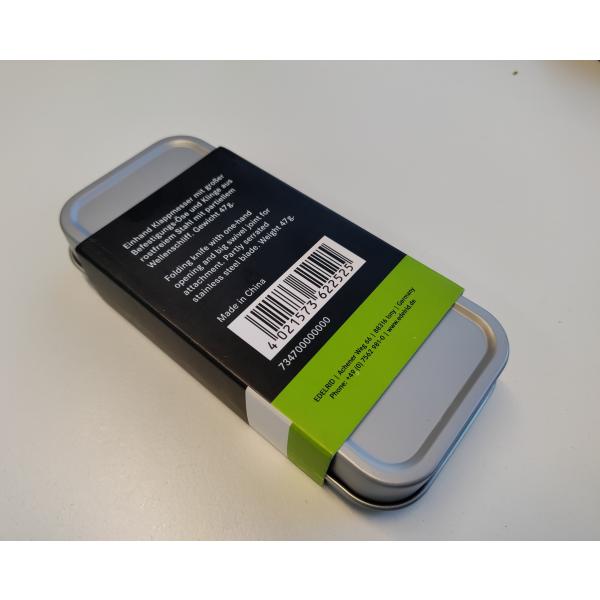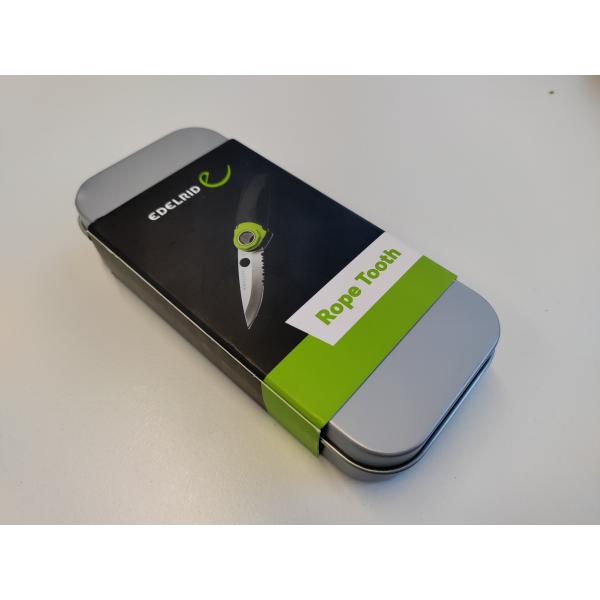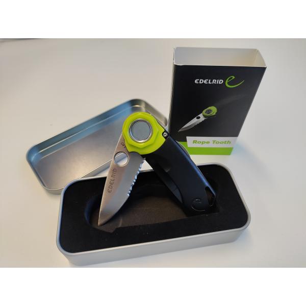 Sharp, locking blade (partly serrated, suitable also for cutting ropes, cords, webbing etc.).