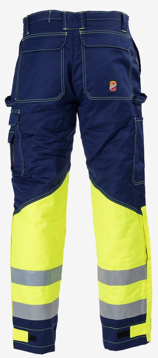 Palosuojatut huomiotalvihousut, talvikäyttöön, jossa tarvitaan palosuojauksen lisäksi hyvää näkyvyyttä. Talvihousuissa on reisitasku ja vuorissa polvitaskut.