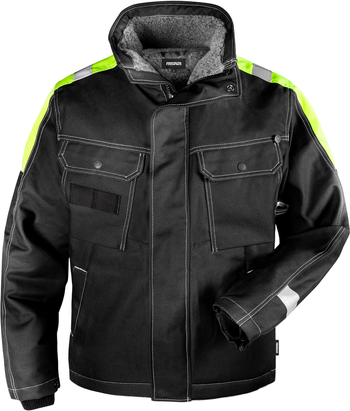 Kestävä talvitakki paksua 100% FAS®-puuvillaa vettähylkivällä pinnalla. Rakentajan takki tekoturkisvuorilla ja heijastavilla yksityiskohdilla parantavat näkyvyyttä. Siirtymässä PFAS-vapaaksi